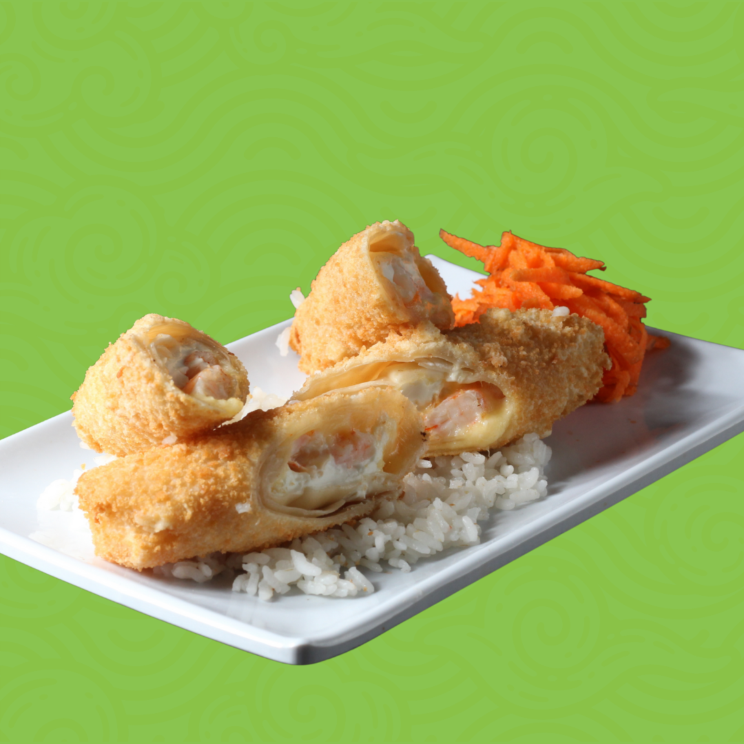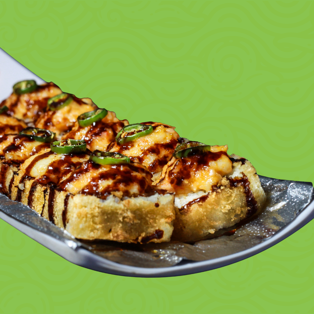 P.D- Res, Pollo y Camarón. Topping de philadelphia, queso chihuahua y aderezo volcano con trozos de tocino y chile serrano. Empanizado horneado.