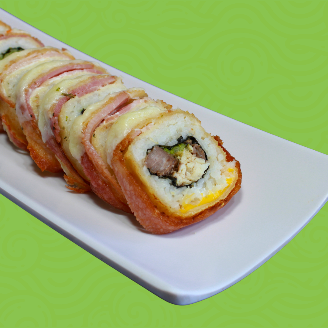 PD: Philadelphia,pepino, aguacate res y pollo forrado completamente de tocino al horno con toping de quesos con camarón y chile serrano