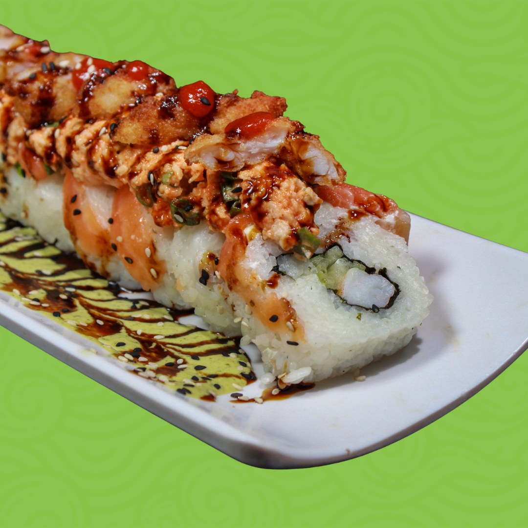 PD:pepino,camarón PF: Philadelphia salmón y aguacate coronado con Tampico spasy camarones empanizados bañado en salsa de anguila puntos de siriacha y ajonjolí
