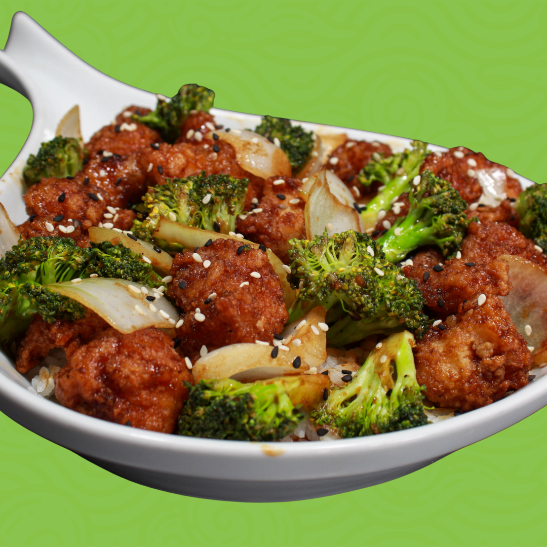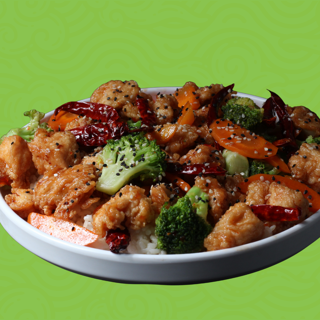 Guiso de trozos capeados de pollo zanahoria brocoli bañado en Orange sauce chili , servido sobre arroz blanco.