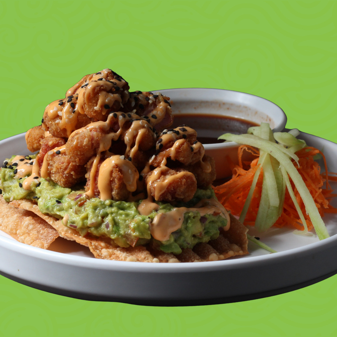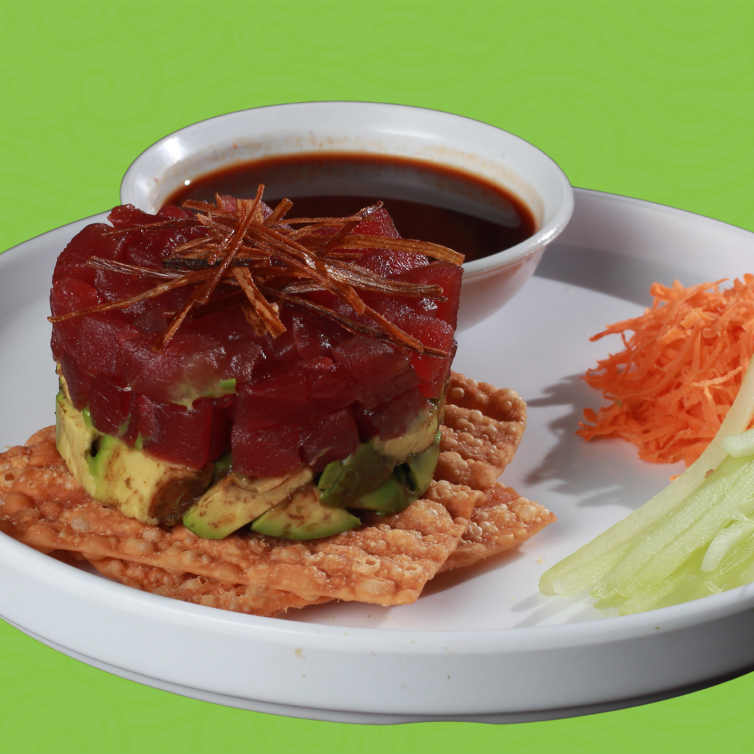 Tostada wonton cama de aguacate revuelto con pico de gallo coronado con crujiente chicharrones de atún bañada en aderezo especial