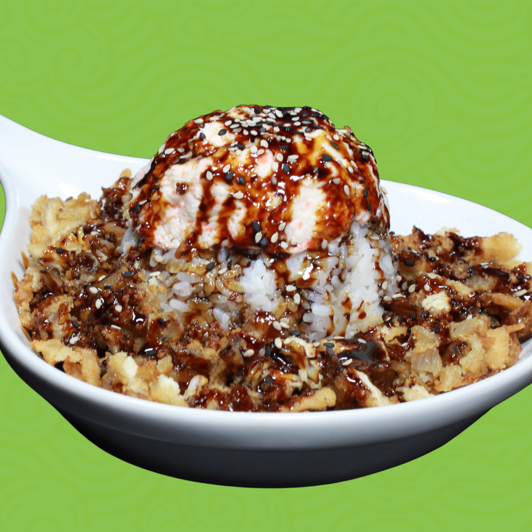 Arroz blanco coronado con Tampico y Philadelphia toping de cebolla y pollo Crispi bañado en salsa de anguila y ajonjolí