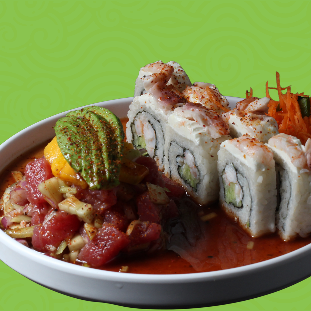 1/2 rollo de pepino, aguacate y camarón forrado de pulpo acompañado de un ceviche de atún fresco aguacate y mango acompañado de jugo de aguachile