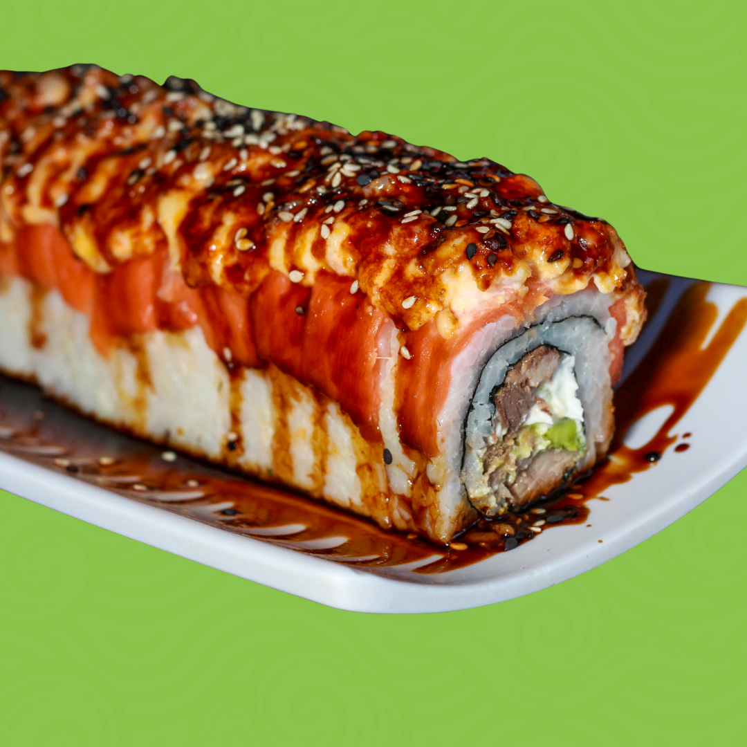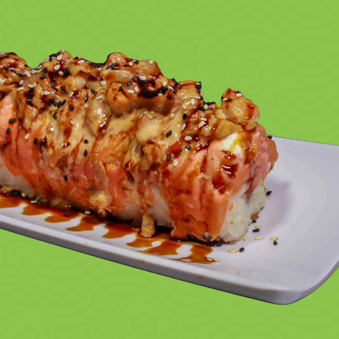 P.D- Res. P.F- Forrado de Salmón. Topping de camarón, chihuahua y aderezo especial bañado en sala de anguila. Natural horneado.