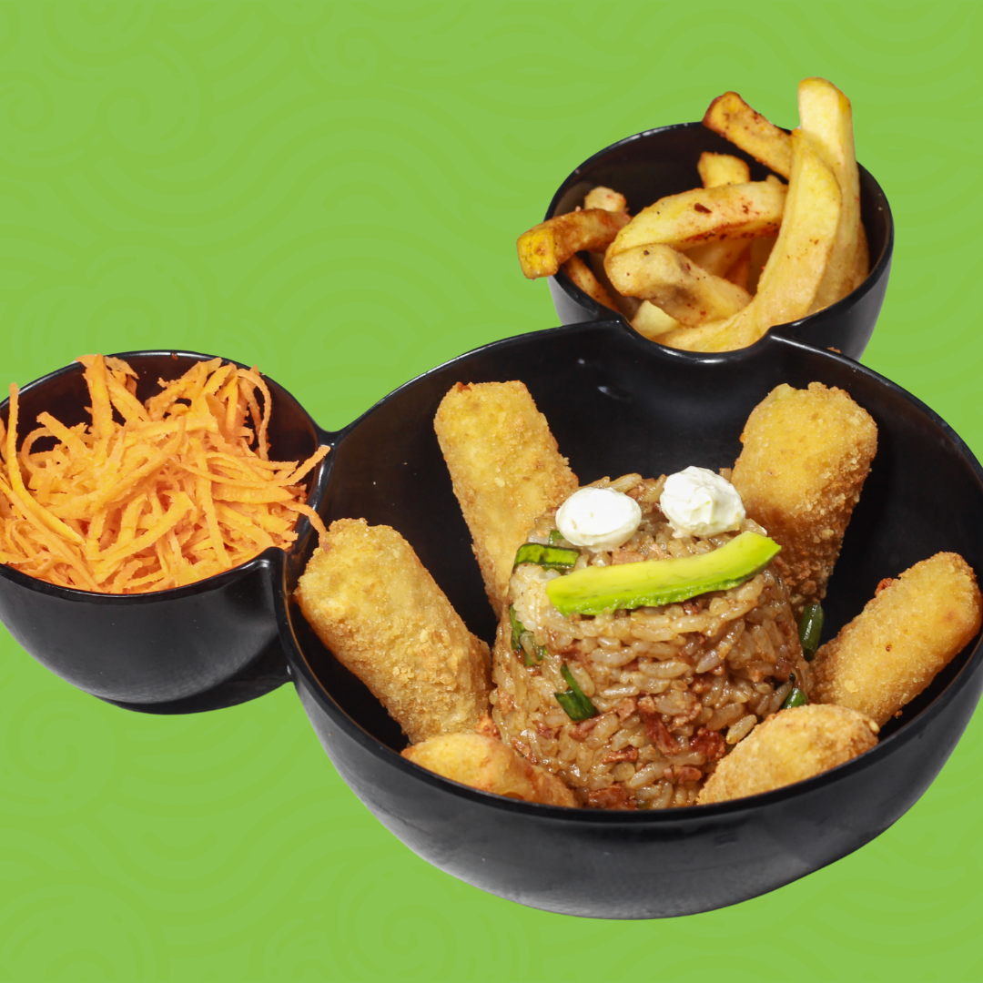 Dedos de queso y mini yakimechi acompañado de papas fritas gelatina y juguete sorpresa