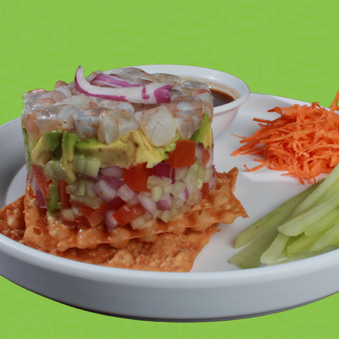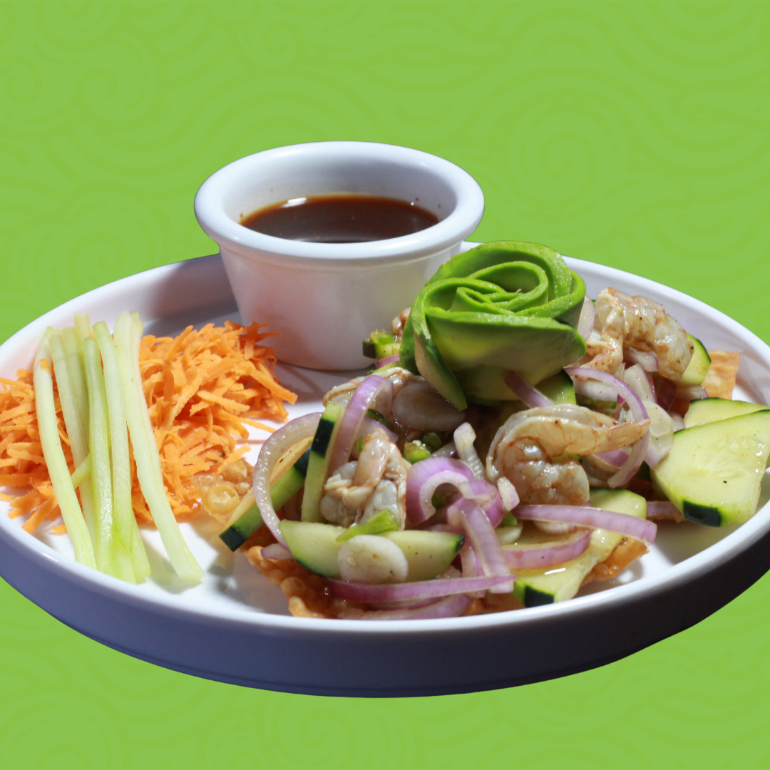 Pepino,cebolla morada,camarón curtido y callo almeja coronado con aguacate acompañada de jugo de aguachile