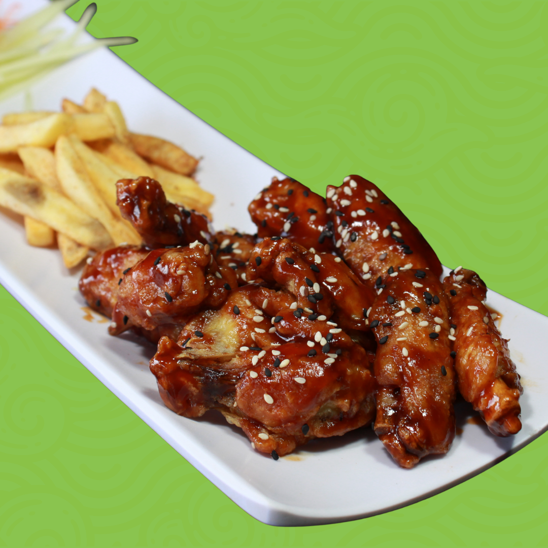 Acompañados de papas y vegetales (salsas, buffalo, bbq o dulces). 12 piezas.
