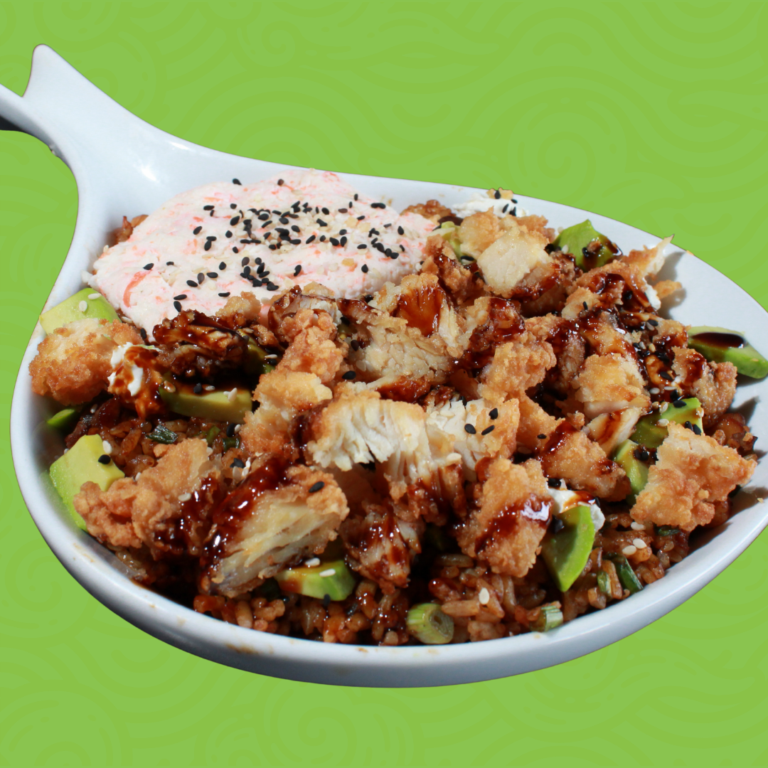 Arroz frito con res y tocino servido con Tampico y Philadelphia cubos de aguacate y pollo crunchy bañado en salsa de anguila