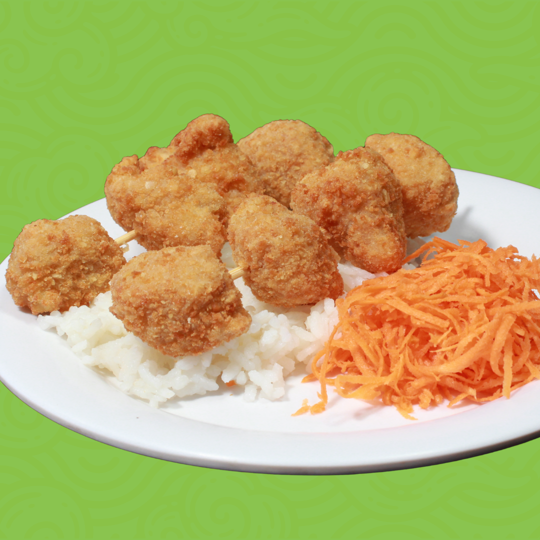 Brocheta de pollo empanizado. Acompañado de arroz blanco. 2 piezas.