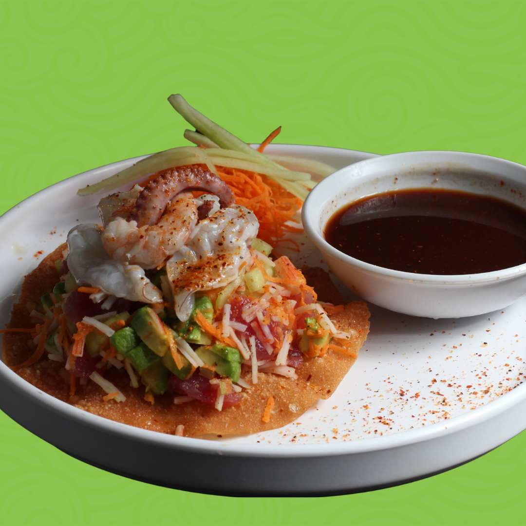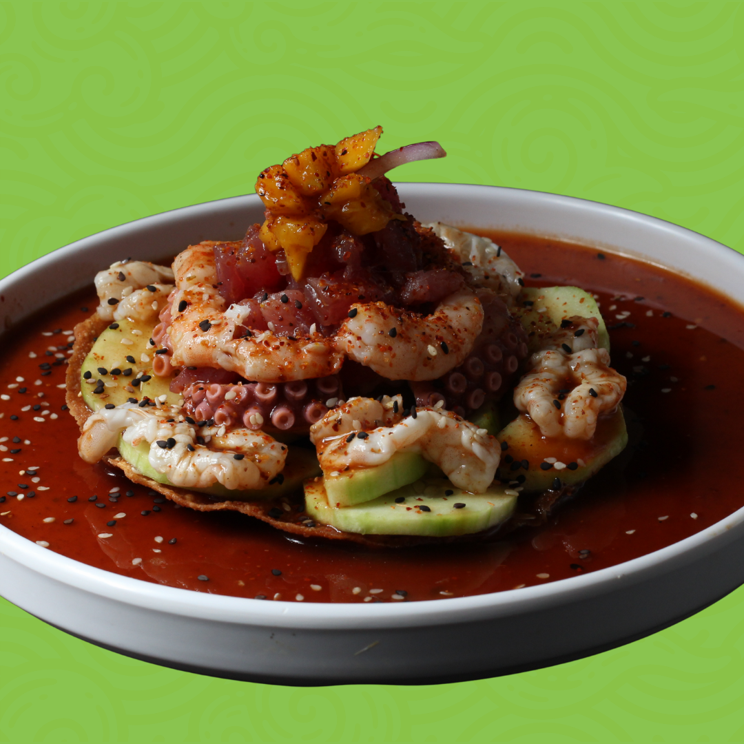 Pepino, aguacate, zanahoria, cubitos de atún kanikama coronada con pulpo y. Camarónes curtidos acompañada de jugo aguachile