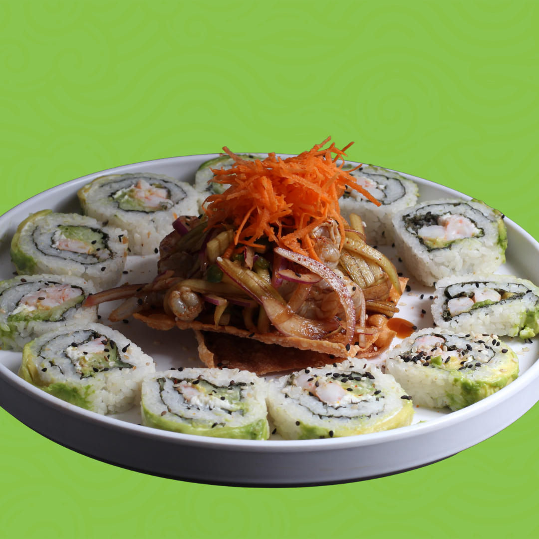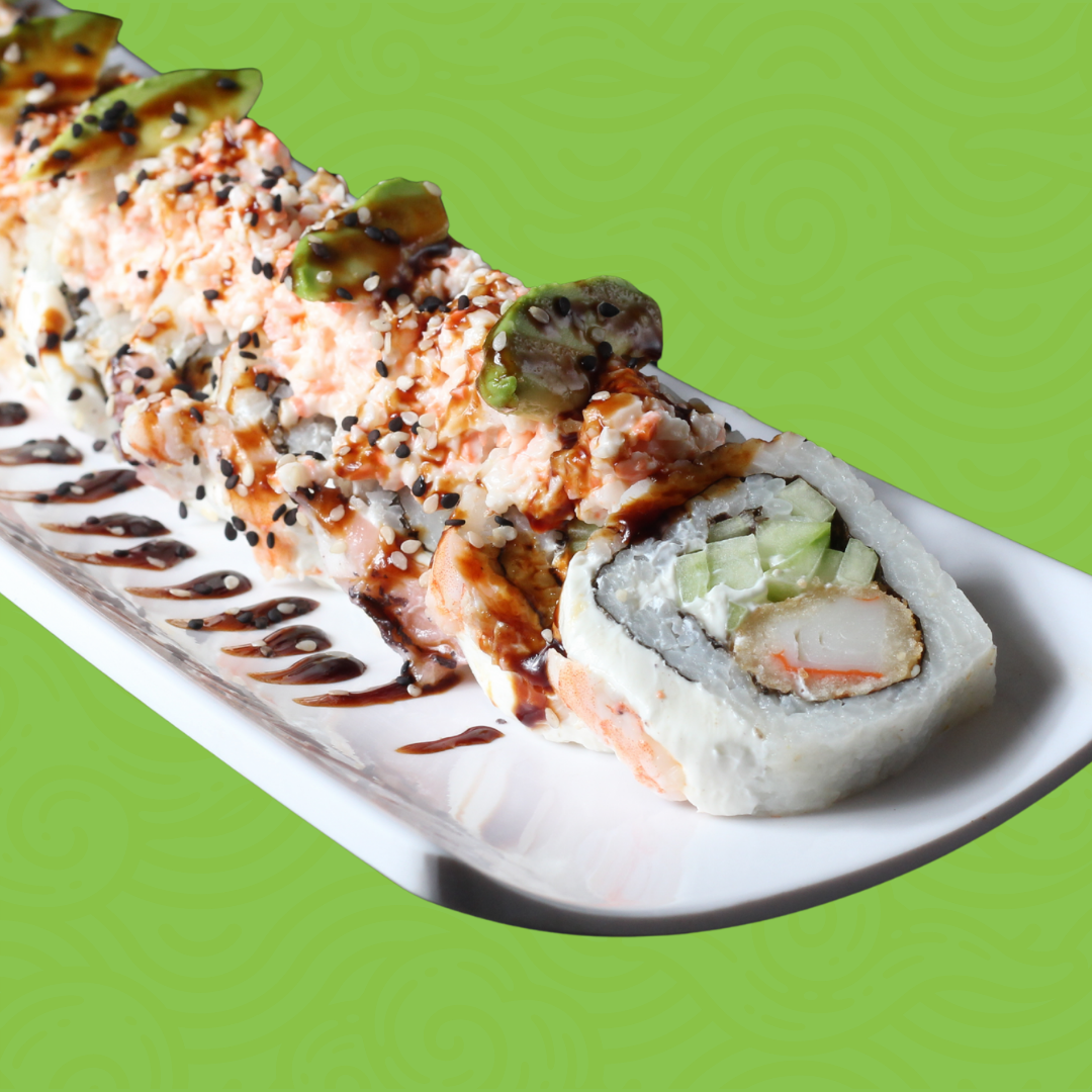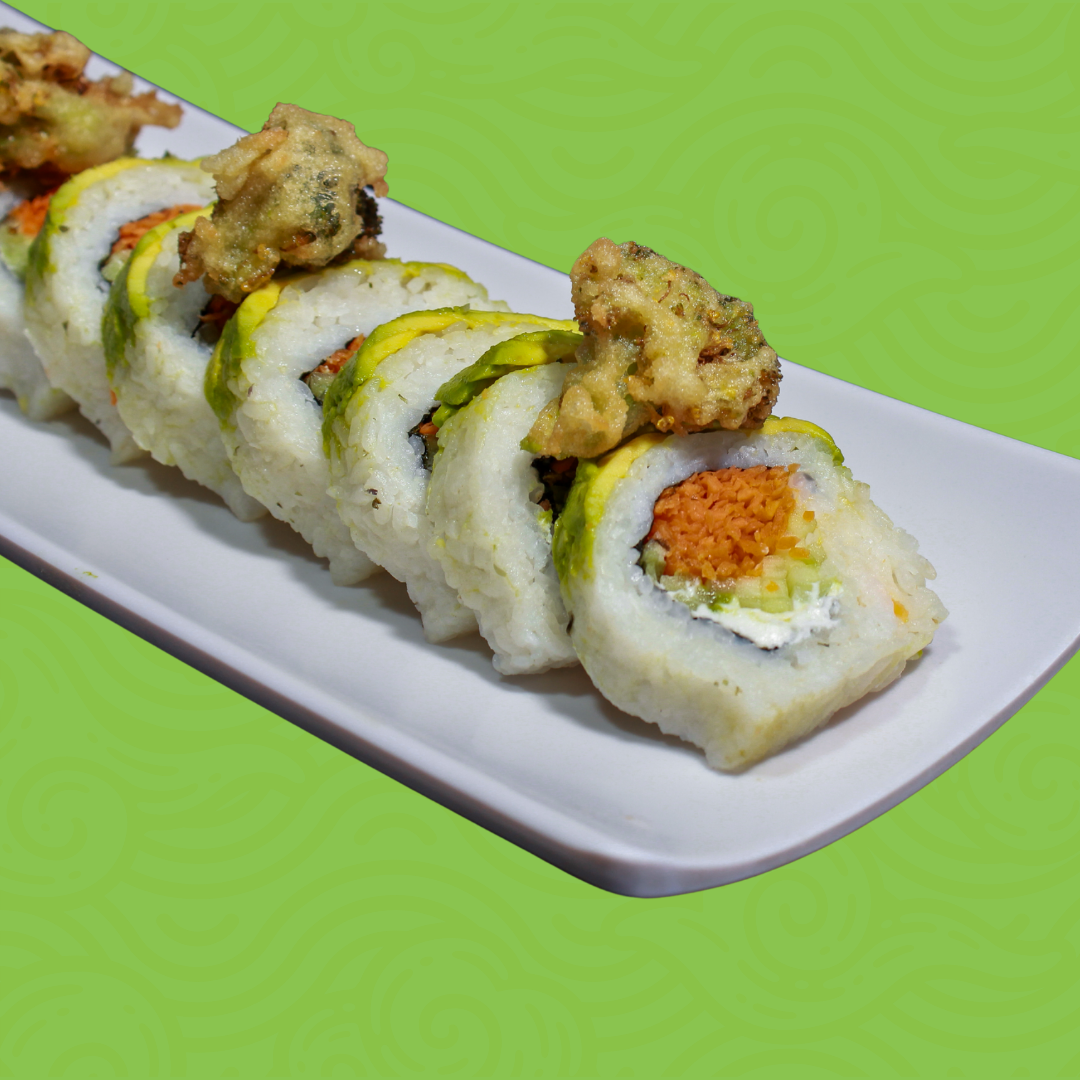 P.D- Philadelphia, Pepino, Zanahoria. P.F- Forrado de aguacate. Topping de brócoli capeado. Acompañado de aderezo cilantro.