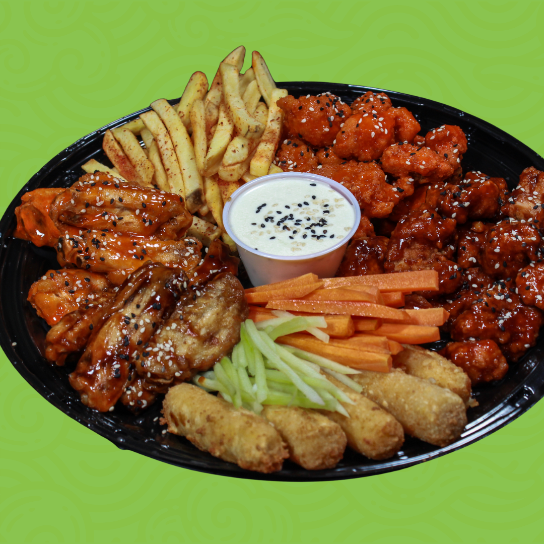 1 orden. de alitas 1 orden. De dedos de queso 2 órdenes de boneles 2 órdenes de papas
