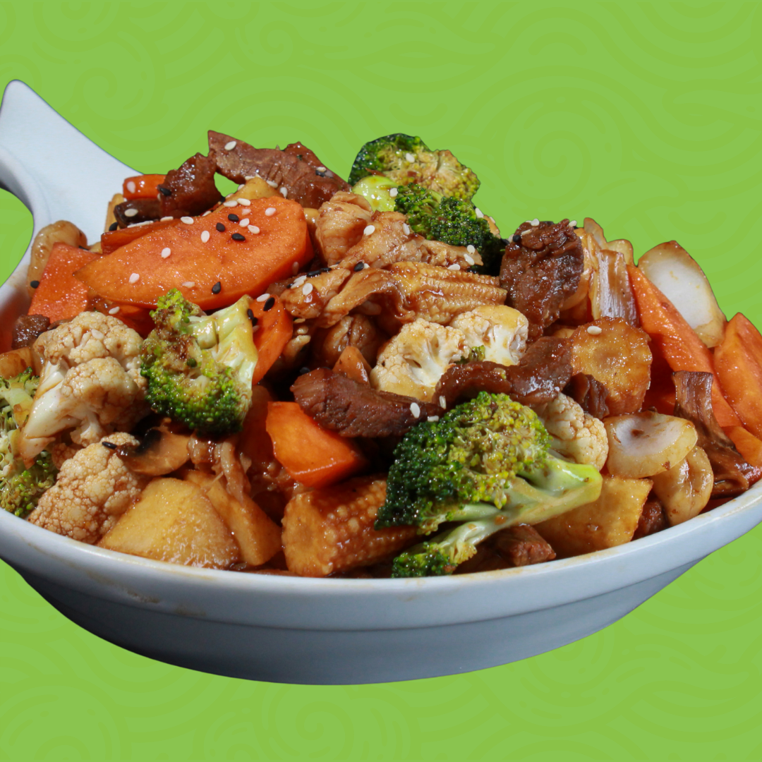 Guiso salteado de brócoli, coliflor, calabaza, zanahoria y cebolla blanca. Mixto (Res, pollo y camarón) servido sobre arroz blanco (dulcecito).