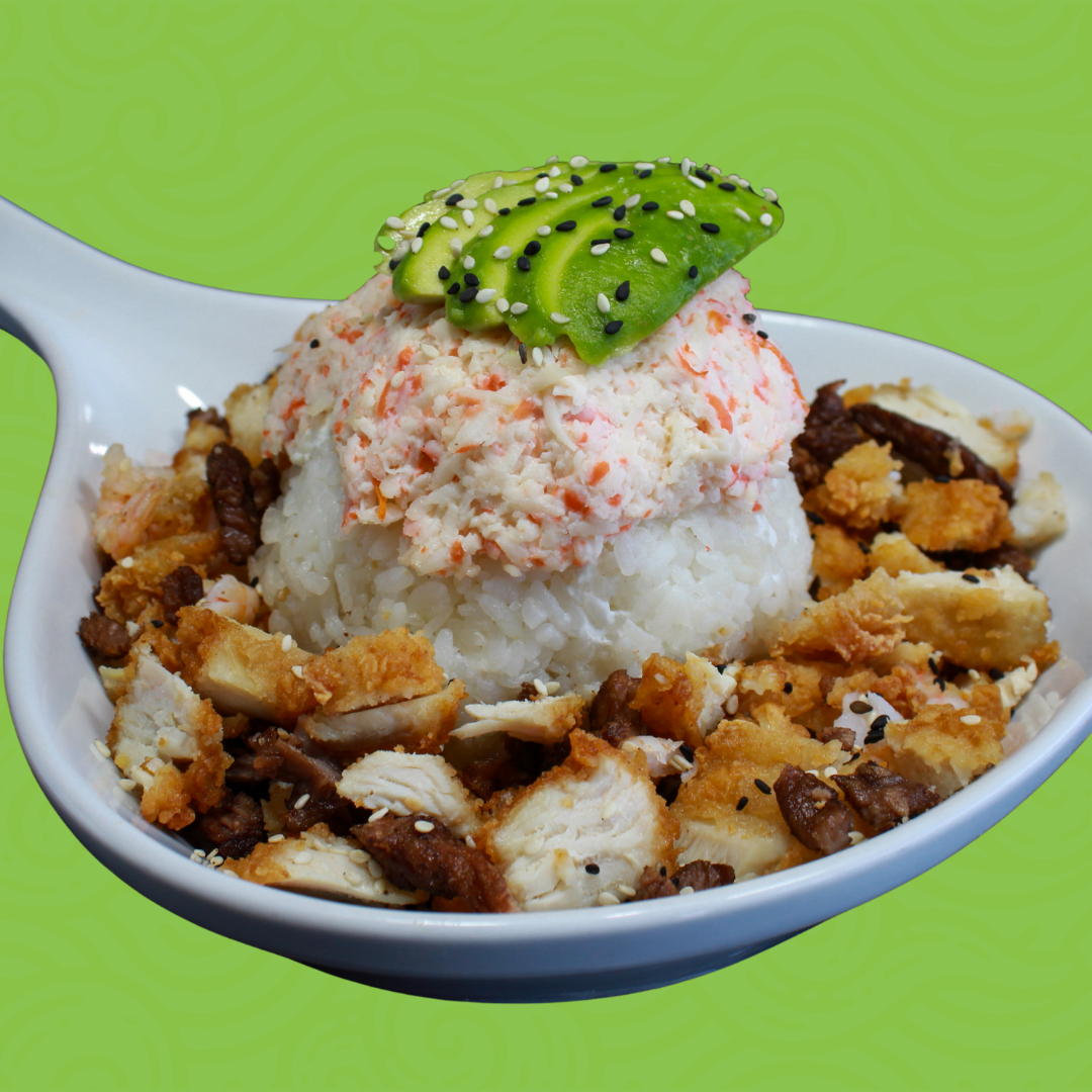 Arroz blanco toping de Tampico Philadelphia rajitas de aguacate coronado con res pollo y camarón