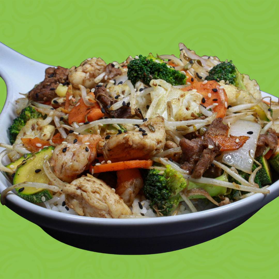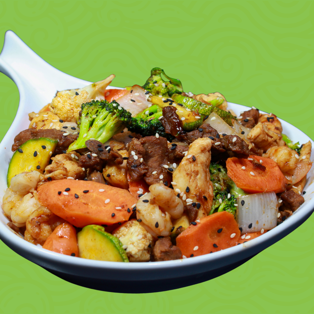 Guiso salteado de brócoli, coliflor, calabaza, zanahoria, cebolla blanca y frijolillo. Mixto (Res, pollo y camarón) servido sobre arroz blanco (Saladito).