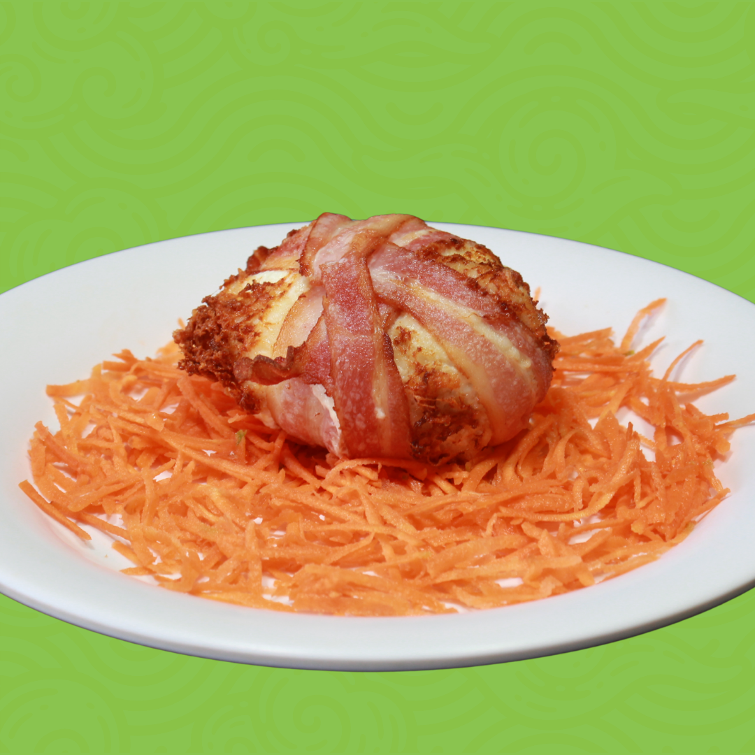 PD.-Res y Tocino. Topping de philadelphia, chihuahua y pollo, bañado en aderezo ranch y bbq. Empanizado horneado.