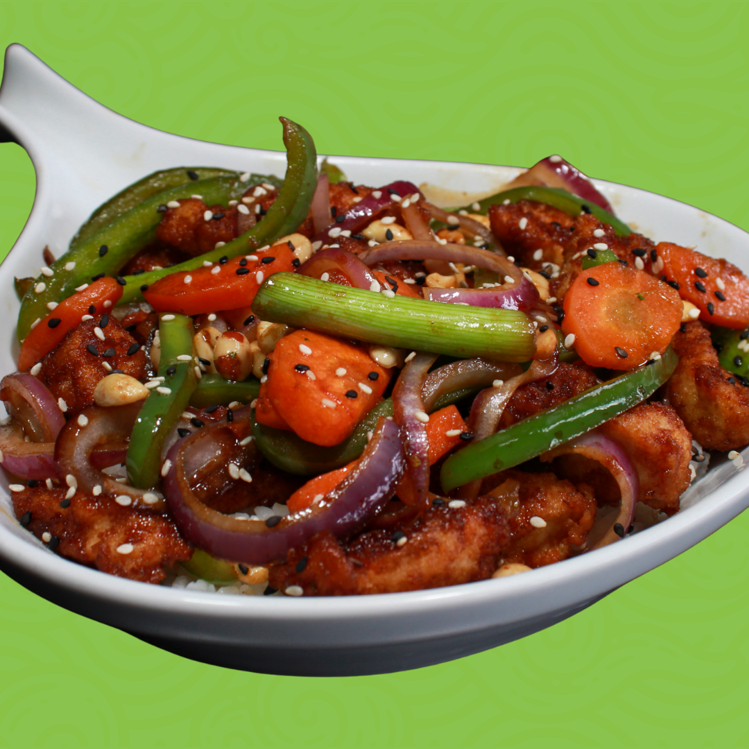 Tallos de cambray, cebolla morada, morrón, zanahoria y cacahuate, con fajitas de pollo empanizado. Servido sobre arroz blanco.