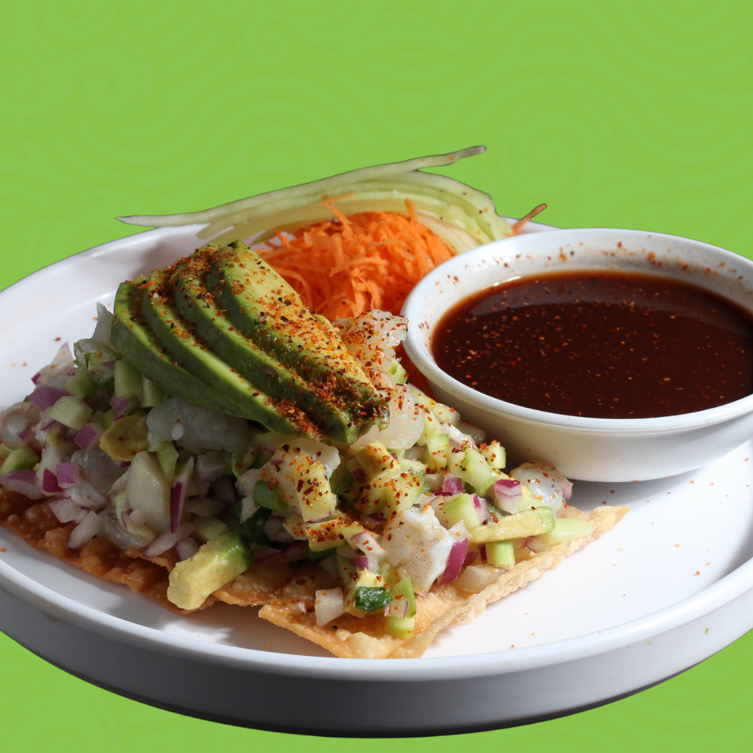 P.D- Pollo y Tocino. Topping de tampico, camarón, chile caribe y rajitas de aguacate.