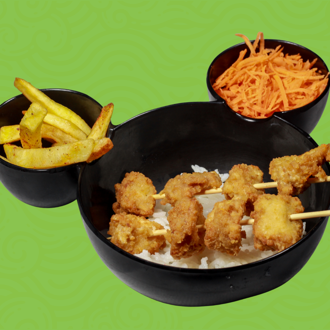 2 brochetas de pollo servidas sobre arroz blanco acompañadas de papas fritas gelatina y juguete sorpty