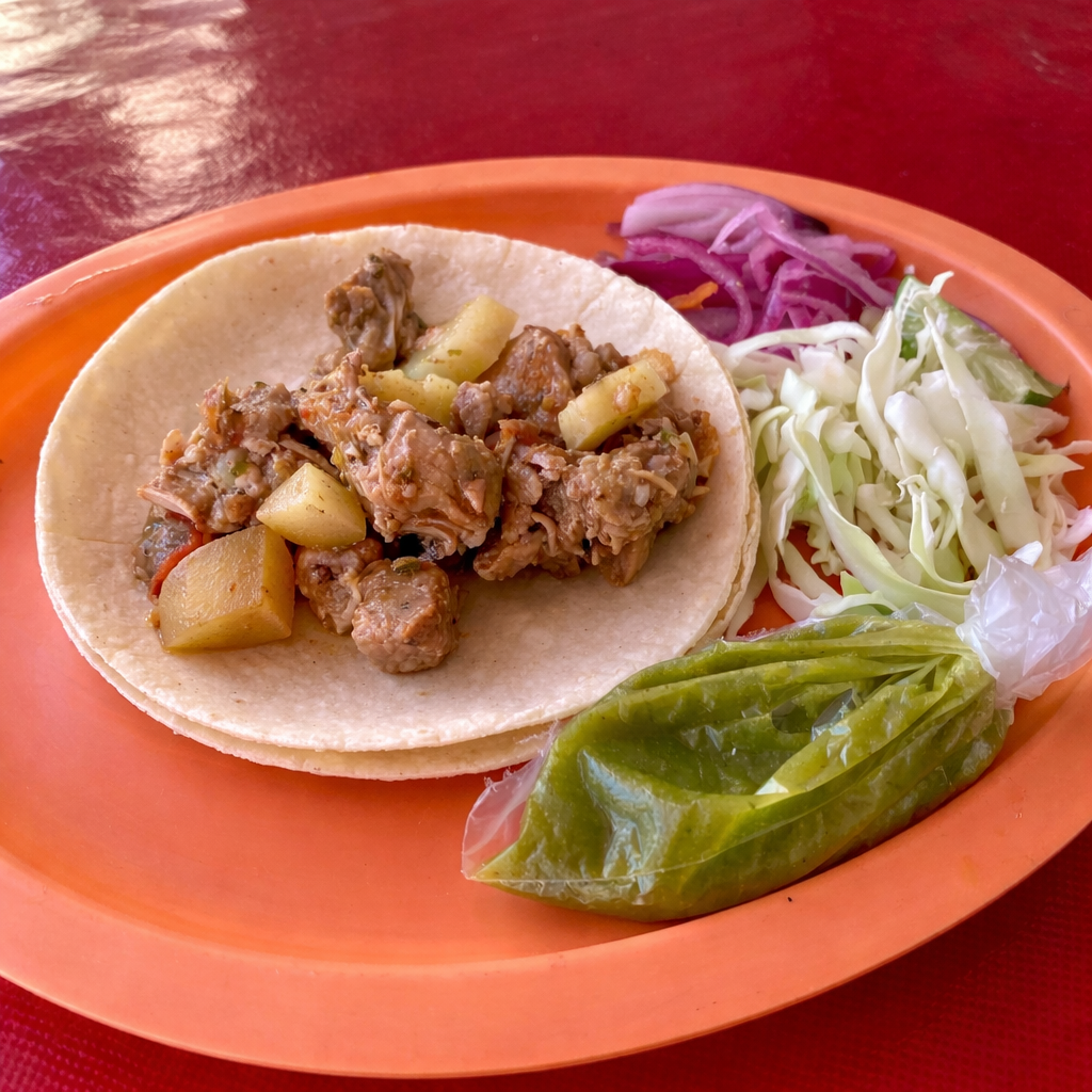 Bistec de puerco guisado en salsa ranchera con tomate, cebolla, chile y papa. Servido en doble tortilla de maíz.