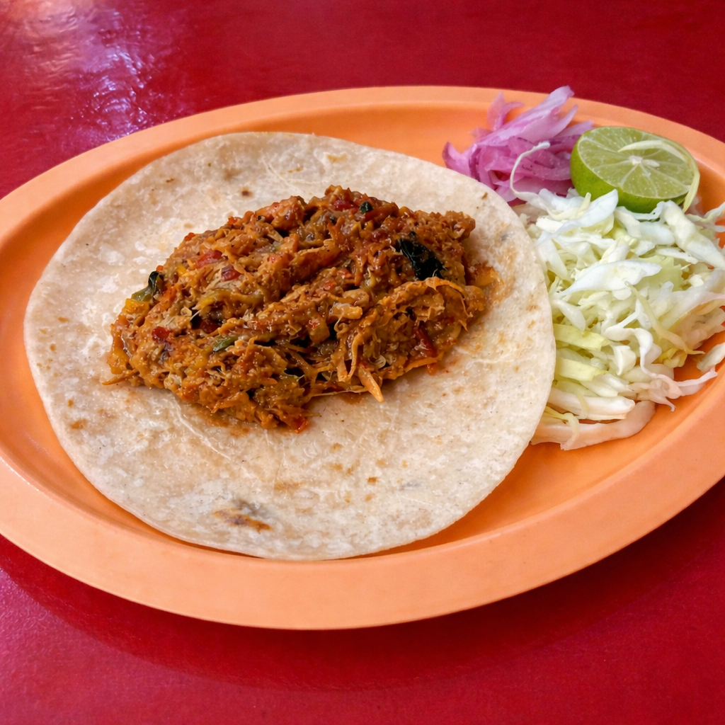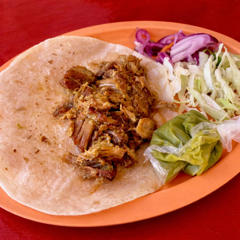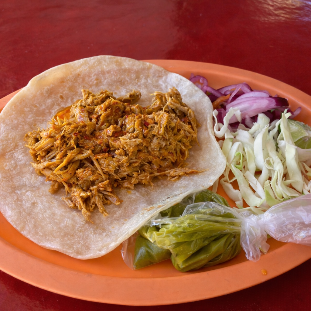 Cochinita de puerco sazonada y jugosa. Servida en tortilla de harina grande y suave..