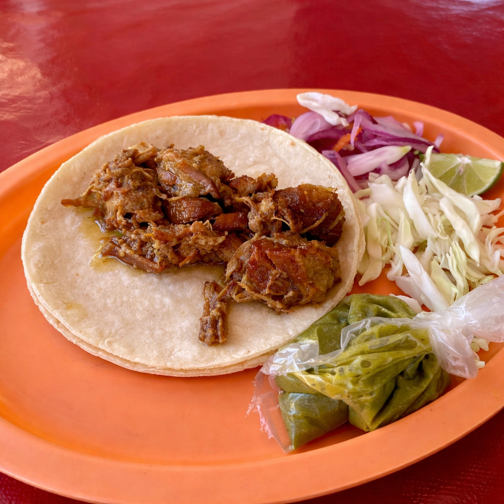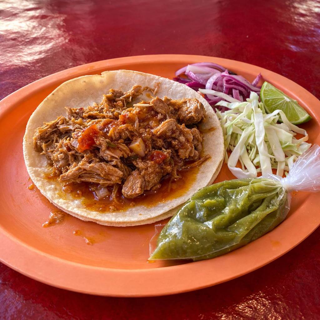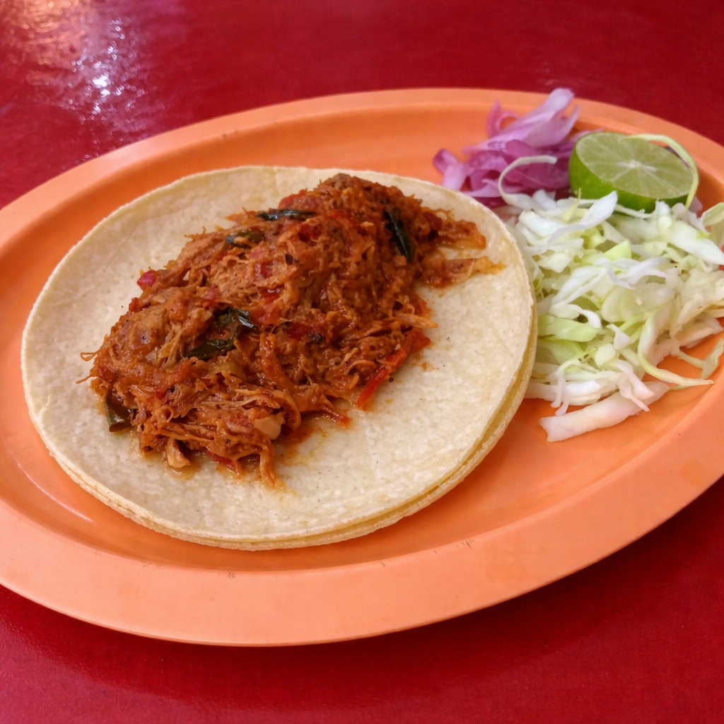 Cochinita de puerco sazonada y jugosa. Servida en doble tortilla de maíz.