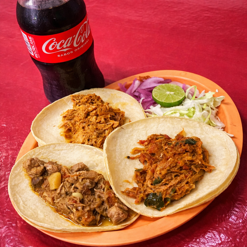 Tres Tacos de maíz de guiso a elegir + Refresco 600 ml a elegir.