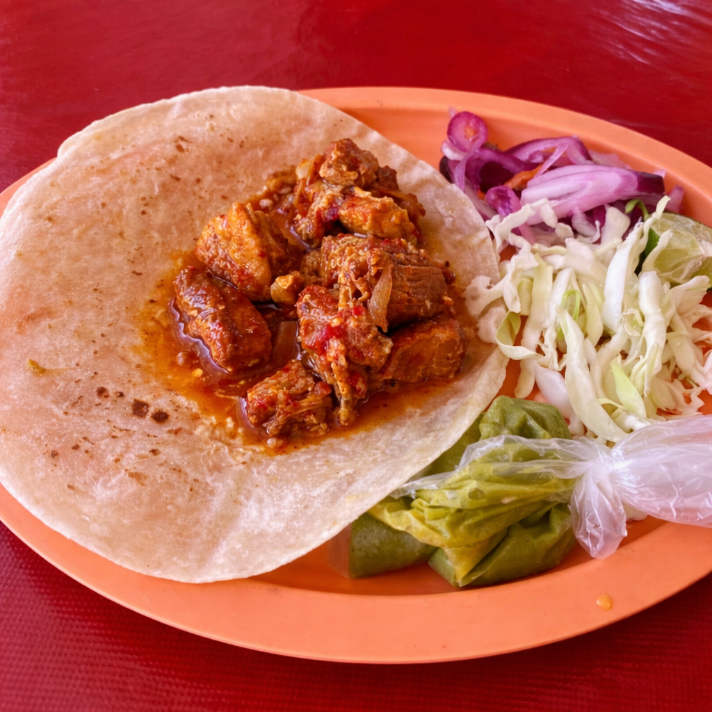 Chilorio bien sazonado con chile, tomate y cebolla. Servido en tortilla de harina grande y suave.