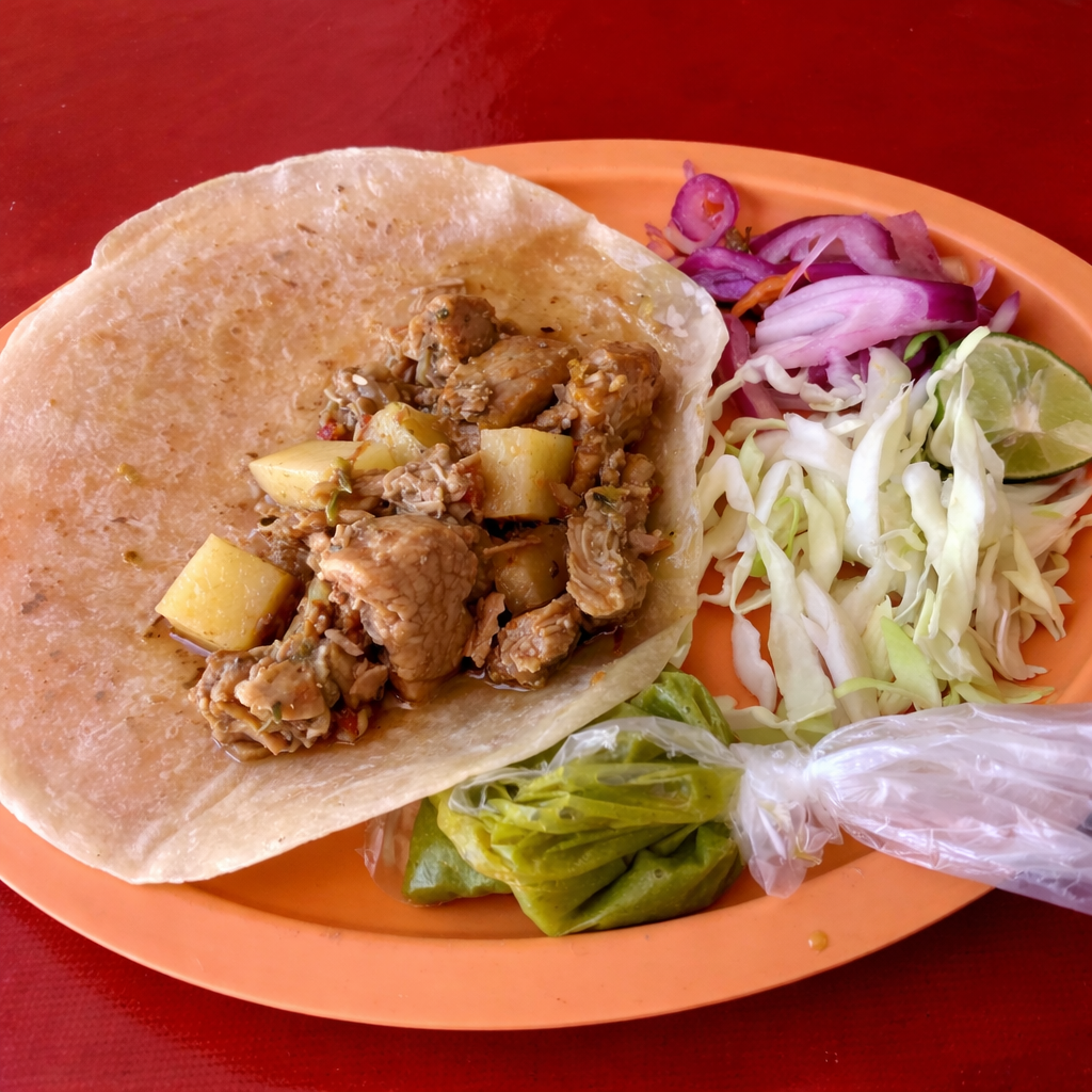 Bistec de puerco guisado en salsa ranchera con tomate, cebolla, chile y papa. Servido en tortilla de harina.