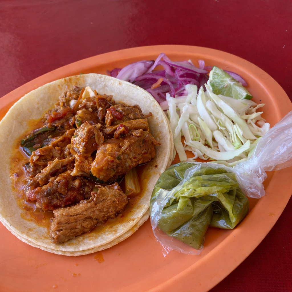 Chilorio bien sazonado con chile, tomate y cebolla. Servido en doble tortilla de maíz.