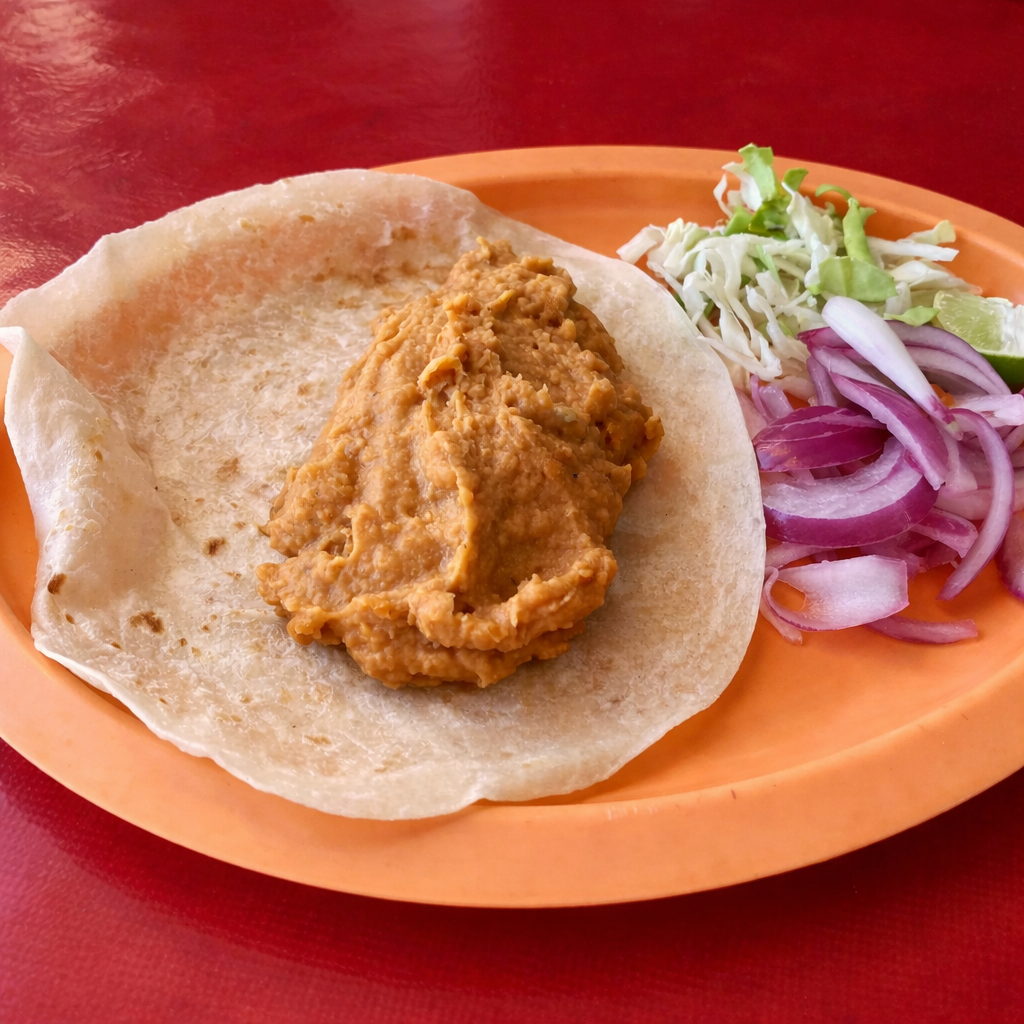 Frijoles guisados con sabor casero, servidos en doble tortilla de maíz.
