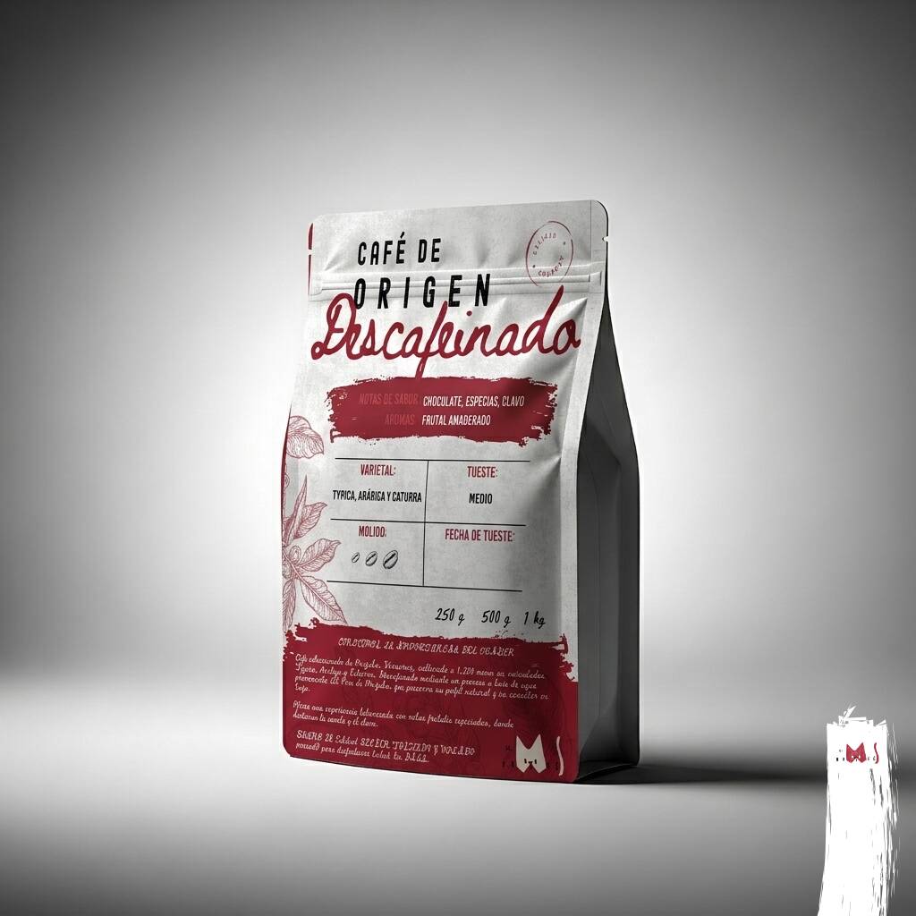 Bolsa con 250 gramos de café descafeinado, grano recién molido para mayor calidad y frescura de sabores.