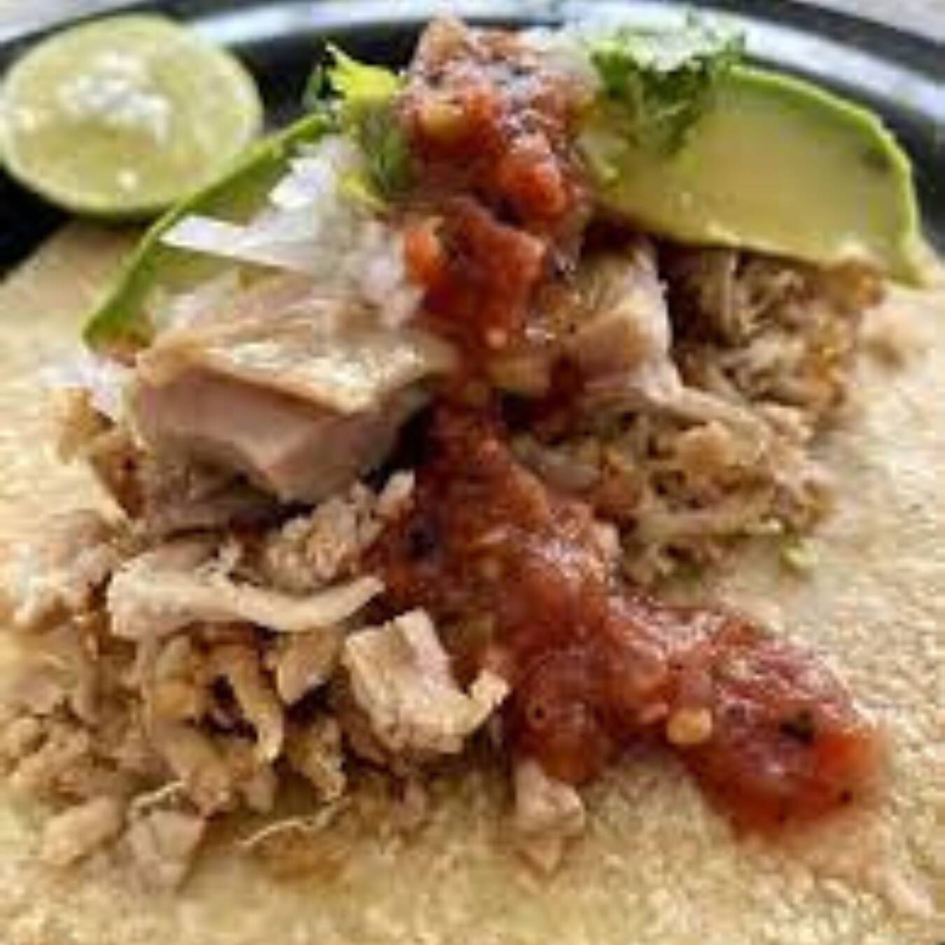 1 Taco de maiz de carnitas de cerdo acompañado de cebolla con habanero, y salsa