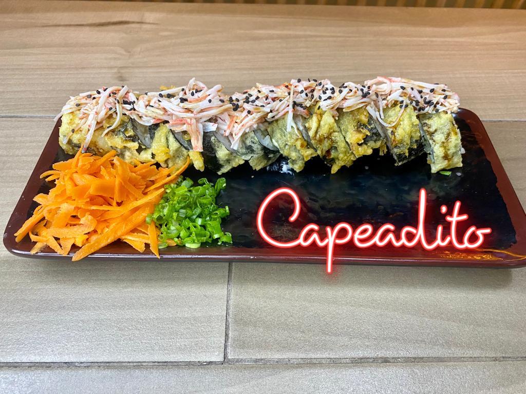 Por dentro camarón, Philadephia, aguacate y pepino. Por fuera capeado con topping de kanikama.