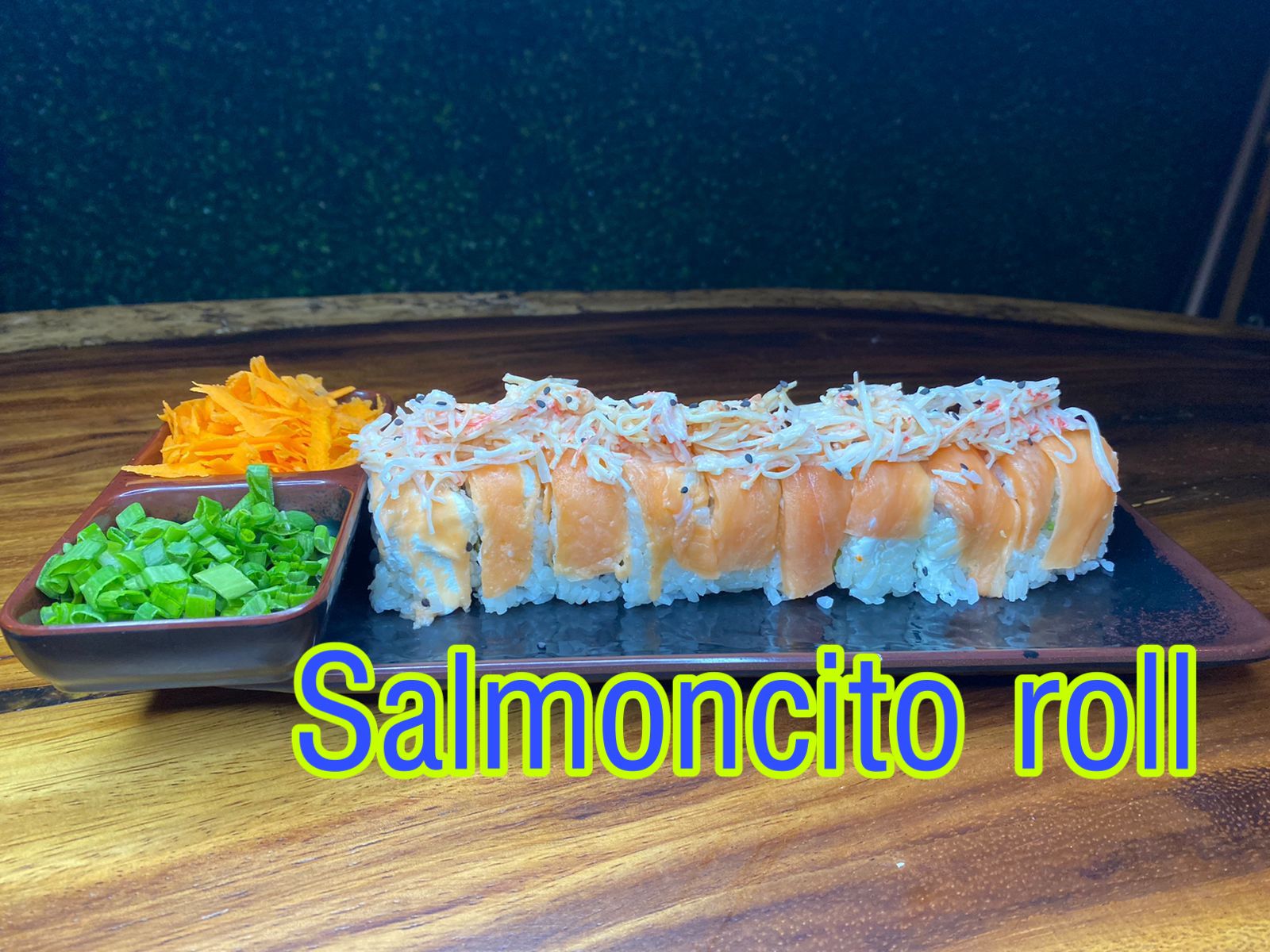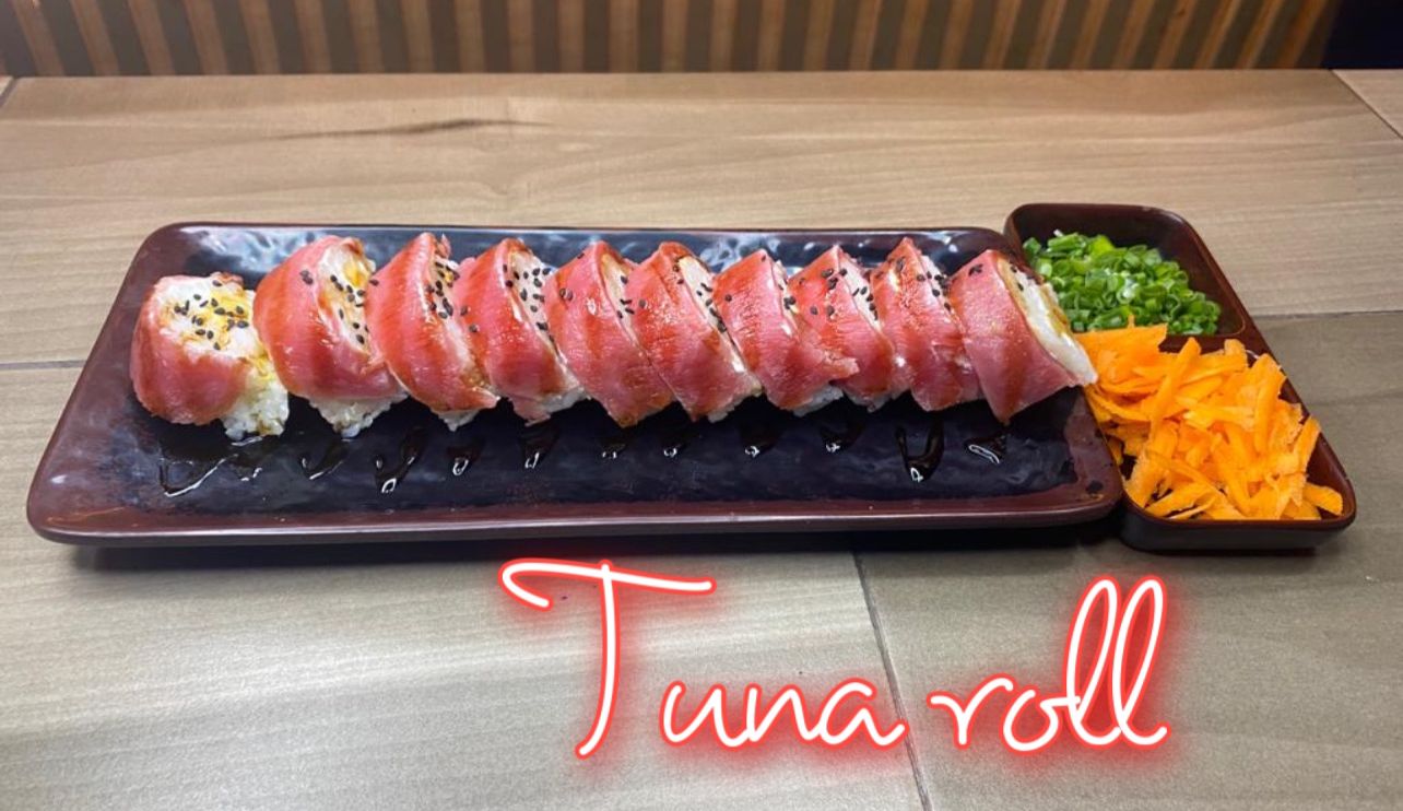 Por dentro camarón, pepino, aguacate y Philadelphia. Por fuera forrado de atún, salmón, camarón y aguacate.