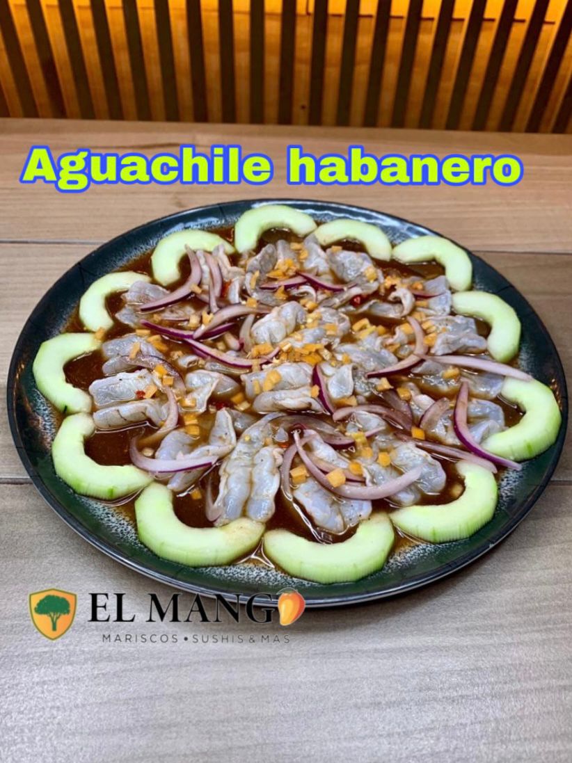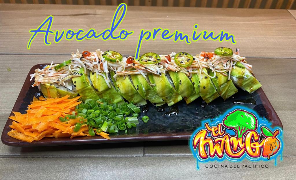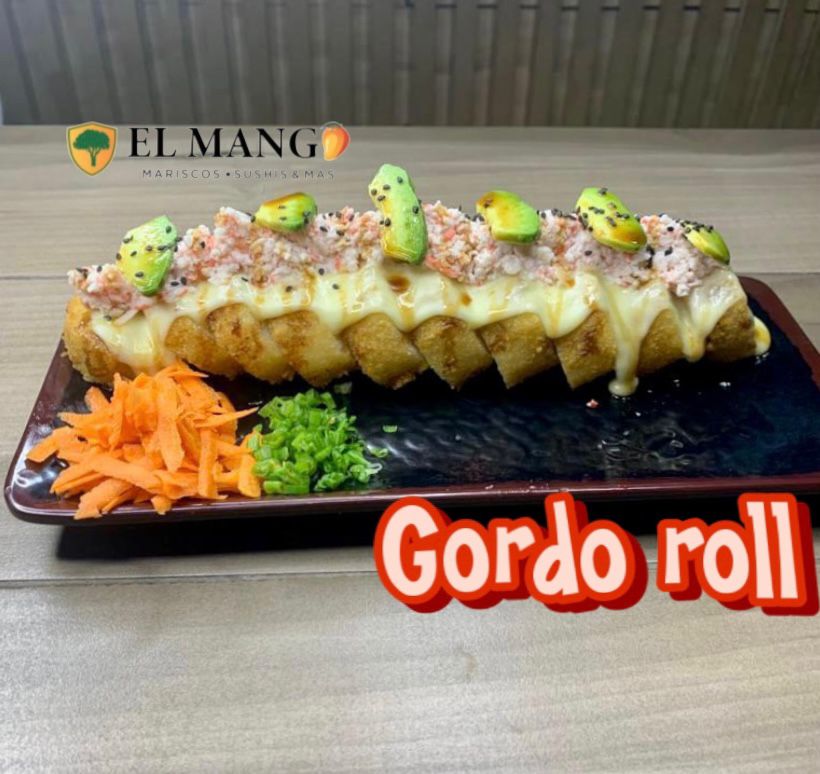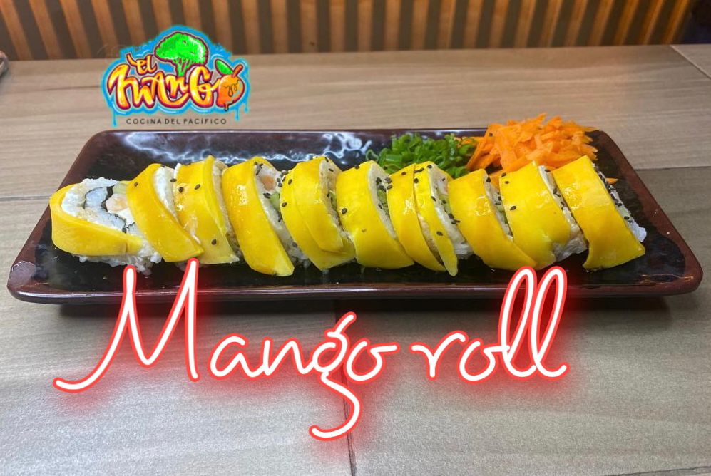 Por dentro, camarón, aguacate, Philadelphia y pepino, forrado de mango.