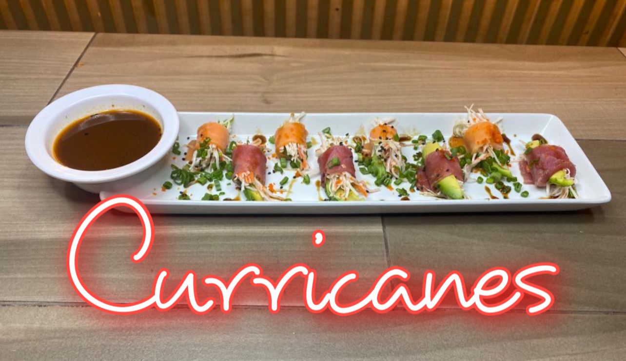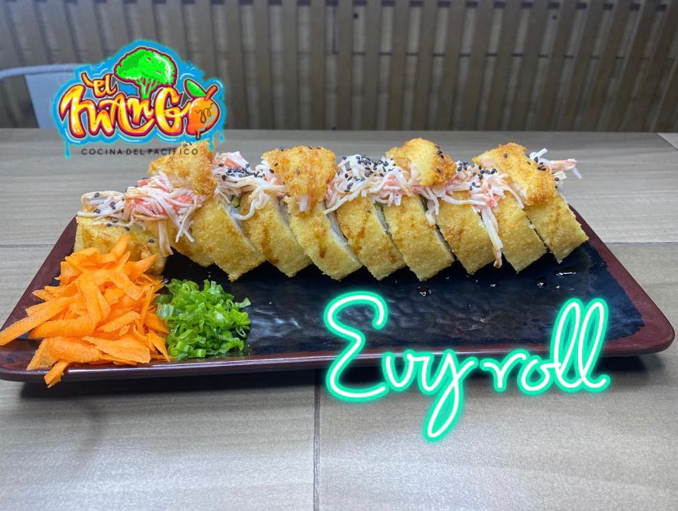 Por dentro aguacate y Philadelphia. Por fuera topping de kanikama de camarón capeado.