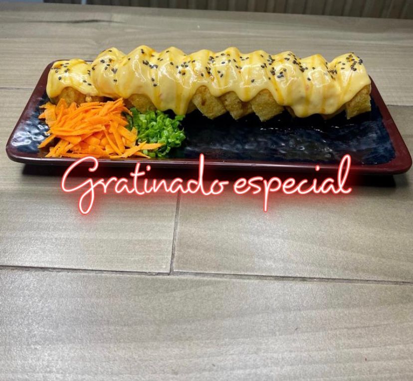 Por dentro camarón, aguacate y Philadelphia. Por fuera gratinado con chipotle.