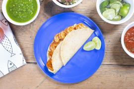 Rico taco a la plancha con queso y camarón. Los camaranes los guisamos en salsa de chipotle.