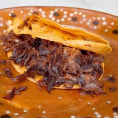 Delicioso taco de carne de res asada con tortillas de maíz hechas a mano, acompañado de salsa bandera, salsa tatemada, guacamole, cebolla y chile toreado.