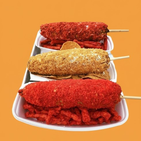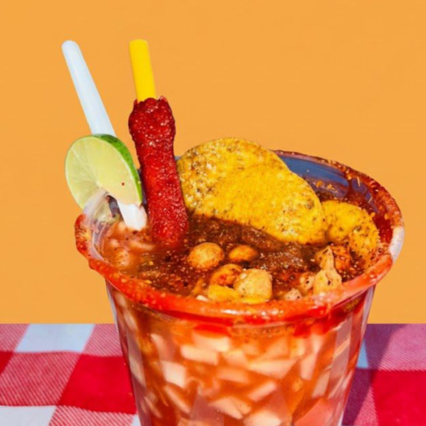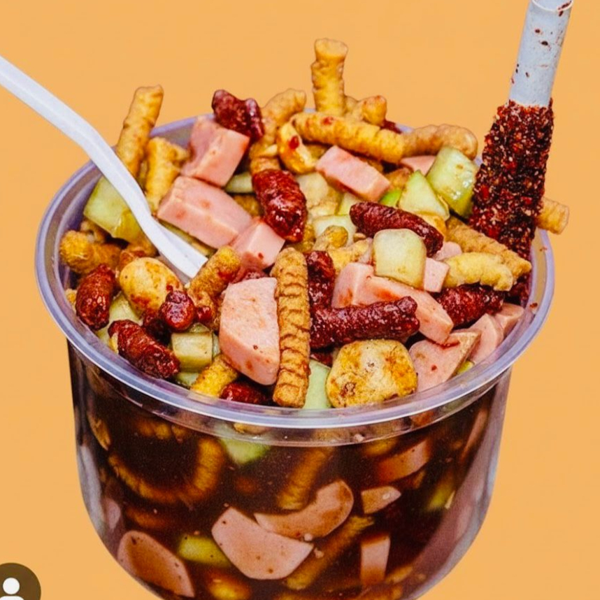 churros crujientes, pepino, salchicha, rielito, cacahuate, tarugo y salsa de la casa