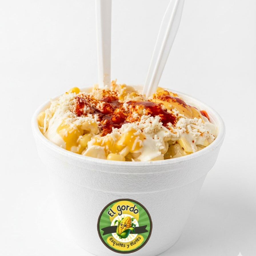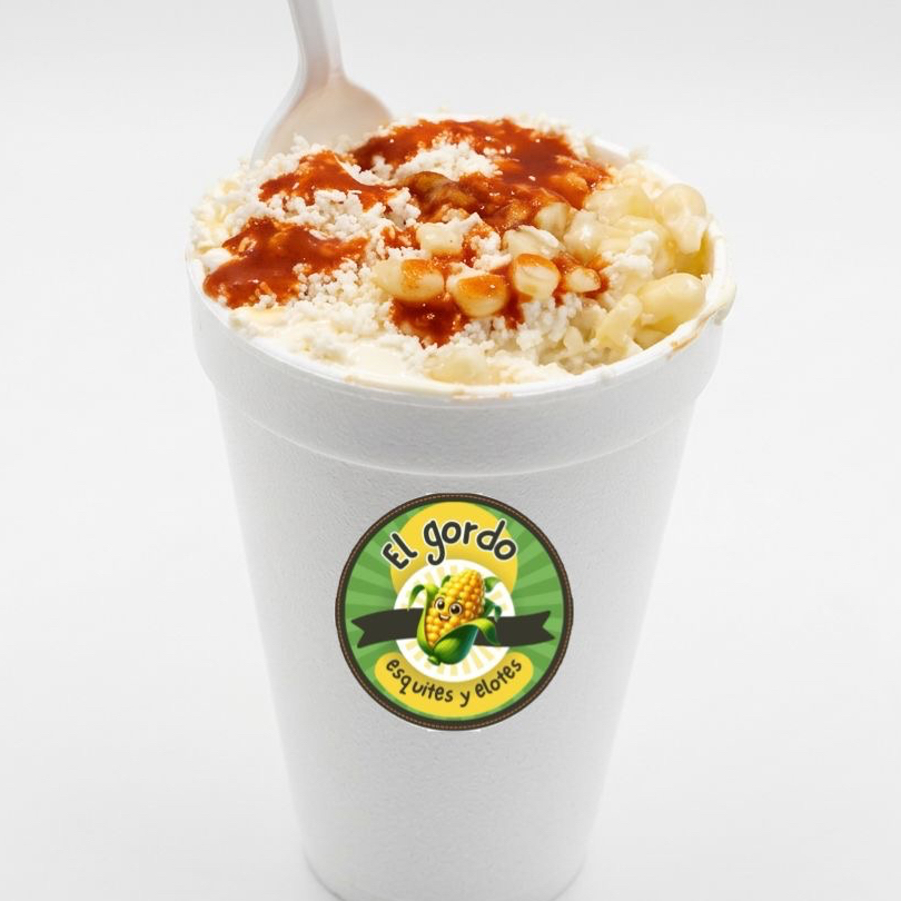 Esquite de un litro, crema mayonesa y queso amarillo con salsas a elegir