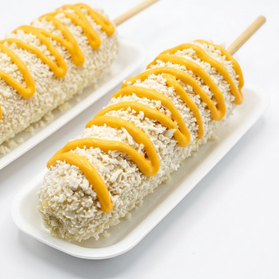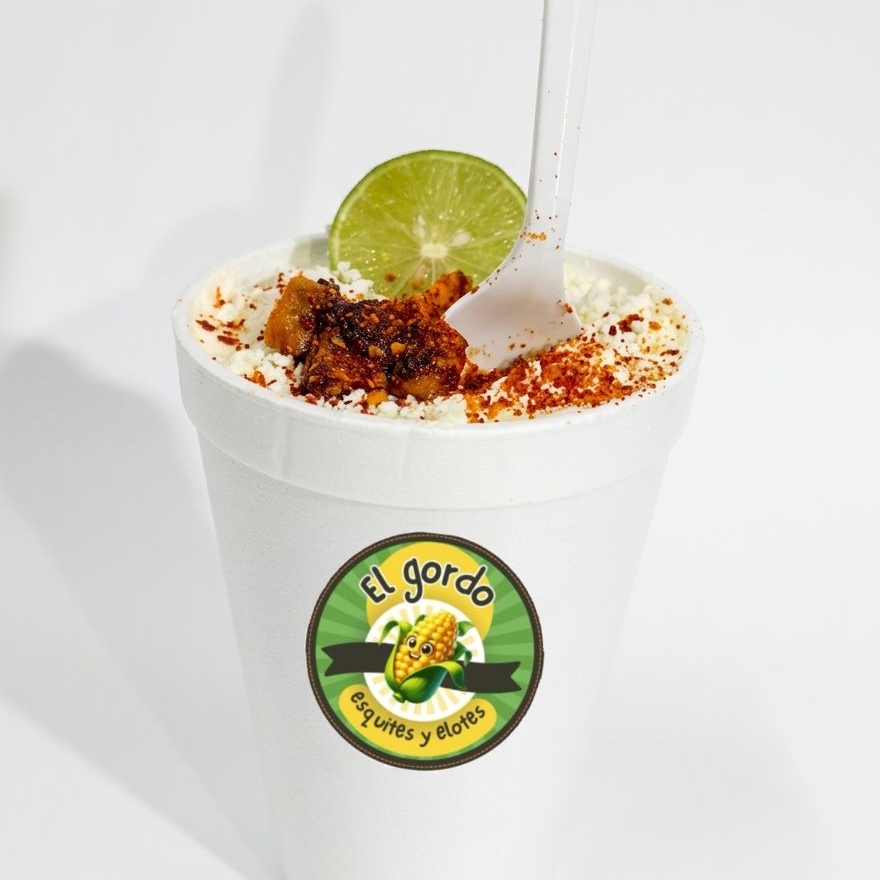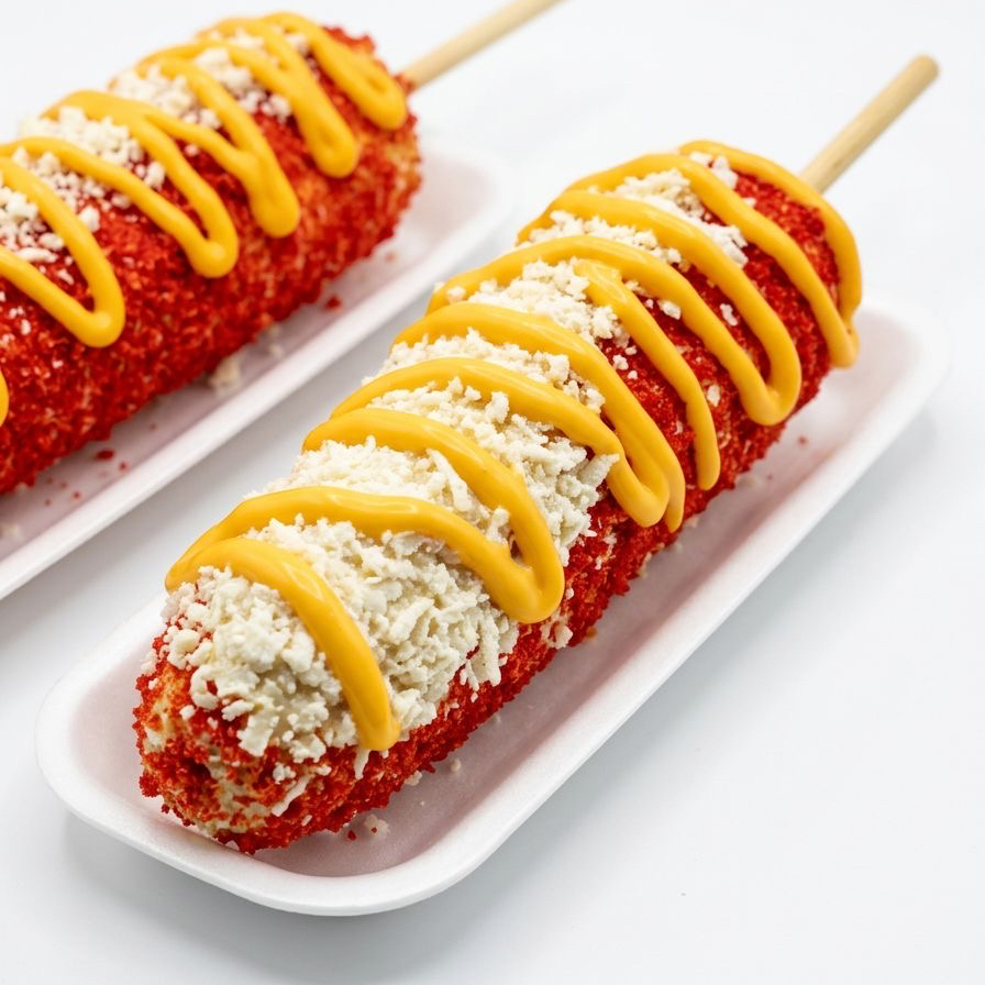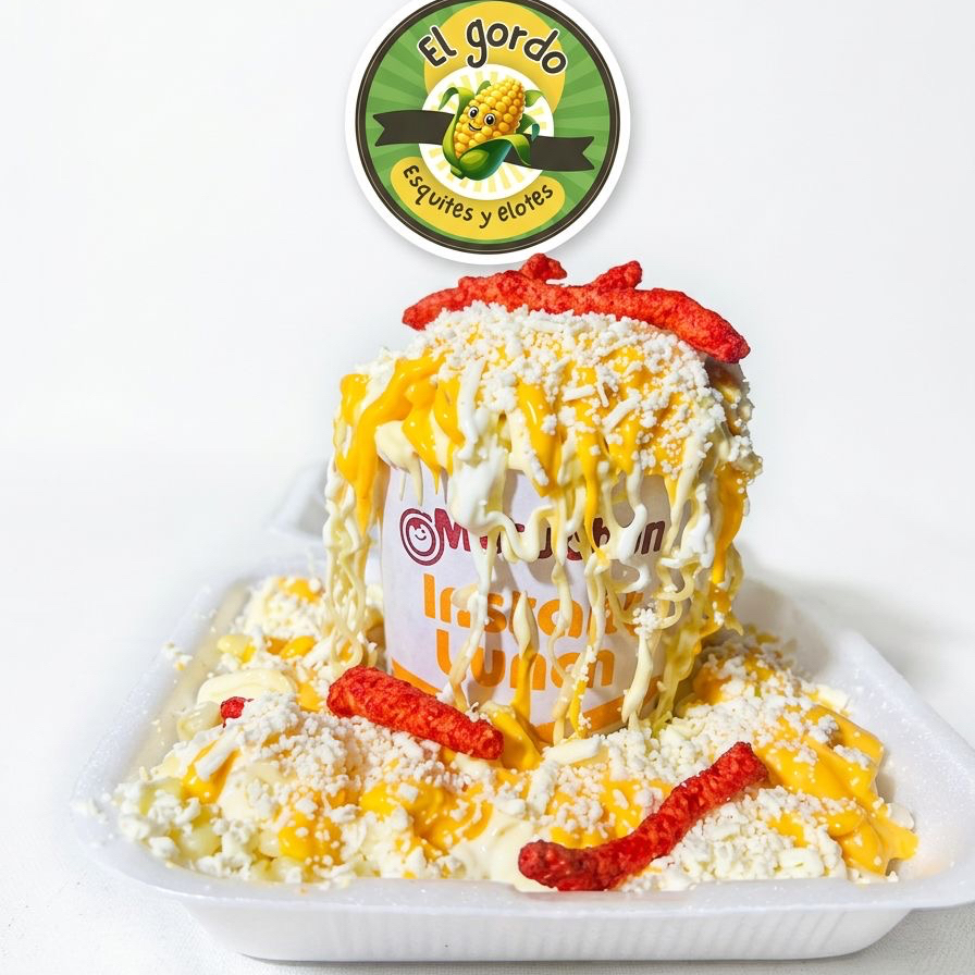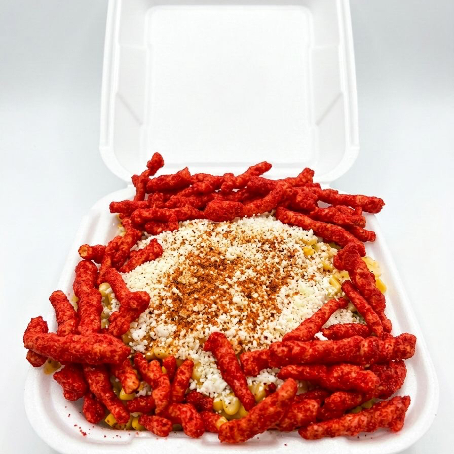 Elote forrado de rufles o cheetos flaming hot con queso amarillo