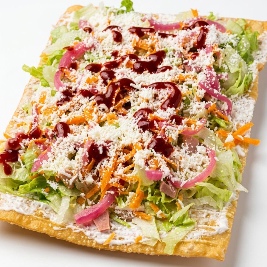 Chimichanga con lechuga, salchicha, zanahoria, cebolla curtida, cueritos y crema