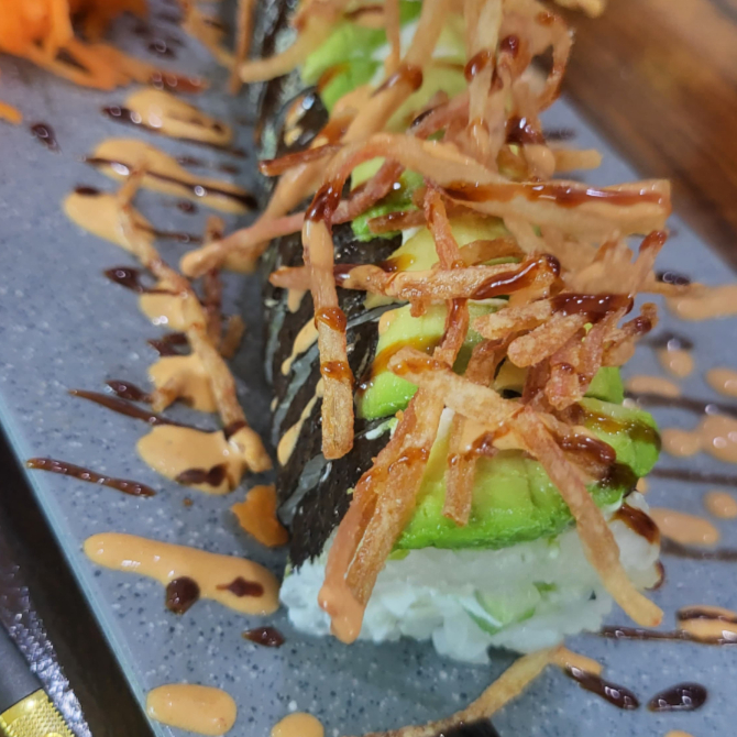 Por dentro: pollo, phila, pepino y aguacate. Por afuera: natural , cubierto de aderezo chipotle y cilantro, con topping de camarones empanizados