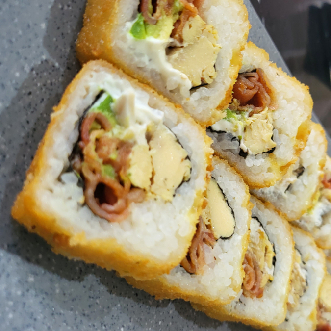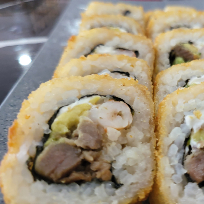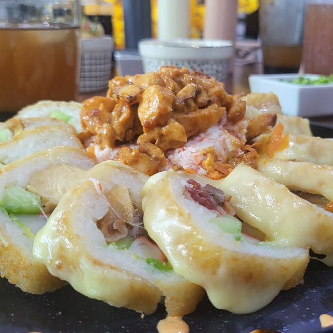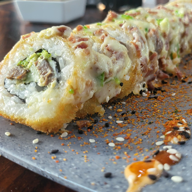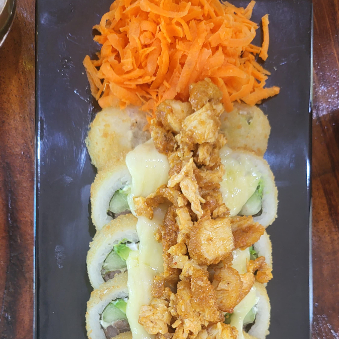 Nuestro rollo estrella. Por dentro: pollo, res, cangrejo y tocino. Por afuera: empanizado, gratinado y como topping pasta de camaron y pulpo frito con salsa de la cas