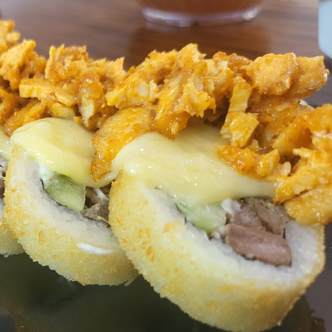 Por dentro: Res, phila, pepino y aguacate. Por afuera: empanizado, gratinado con topping de pasta de pollo