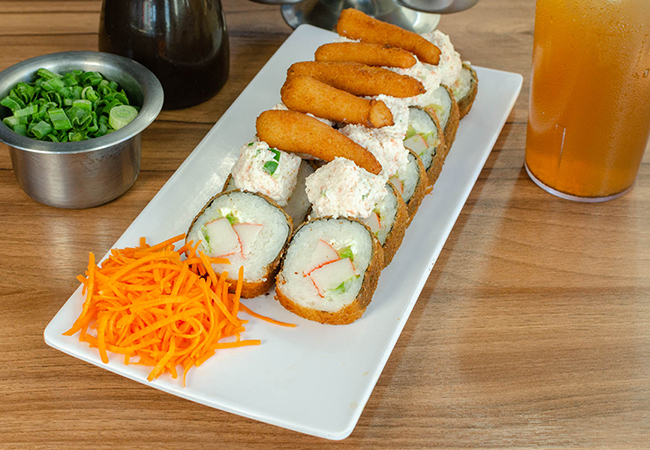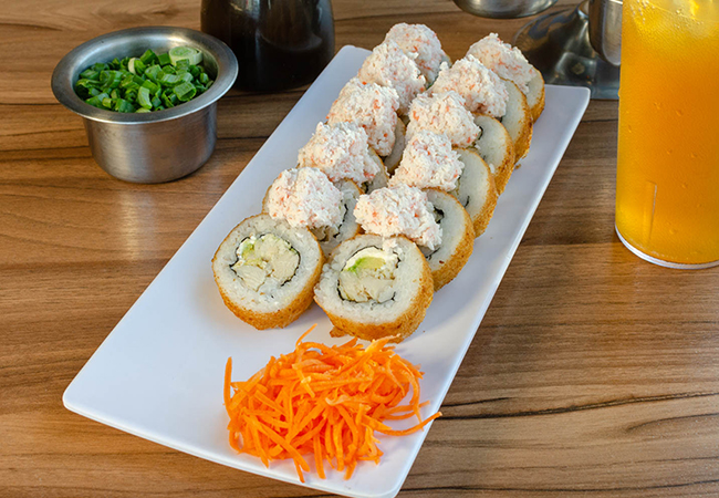 Arroz frito con cebollín, zanahoria, aguacate, philadelphia, tampico y deliciosos pedacitos de camarón y cubitos de queso empanizados.