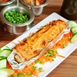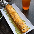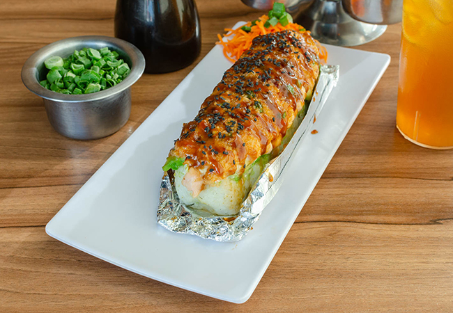Rollo empanizado relleno de res, chile caribe, aguacate y philadelphia. Bañado con salsa BBQ y trocitos de tocino.