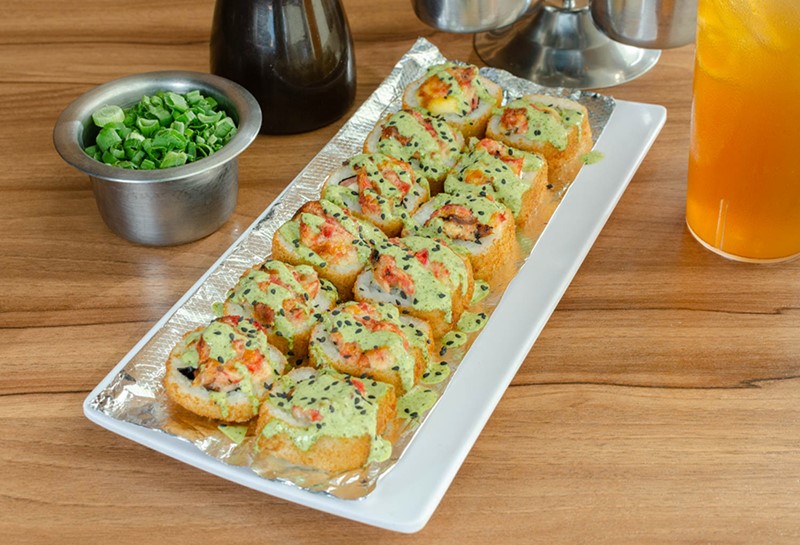 Rollo empanizado relleno de camarón, aguacate y philadelphia. Spicy de philadelphia, queso chihuahua y trocitos de pulpo; con espejo de cilantro bañado con aderezo de sriracha.